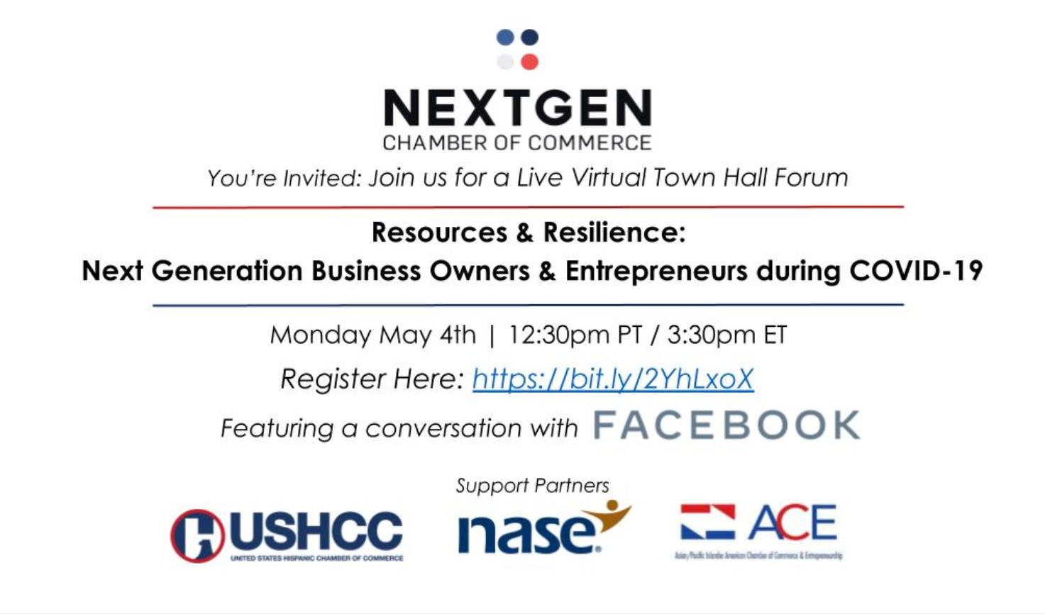 NextGen Chamber of Commerce and Facebook have partnered to inform America’s entrepreneurs and small business owners on public and private resources available to them during this time, as well as hearing from their colleagues about the impacts of COVID-19 and adaptation and resilience efforts in light of this global pandemic. Additionally, the town hall forum will open to a discussion about what reopening the economy might look like and how entrepreneurs can build their business in a way that is more financially resilient in these precarious times.