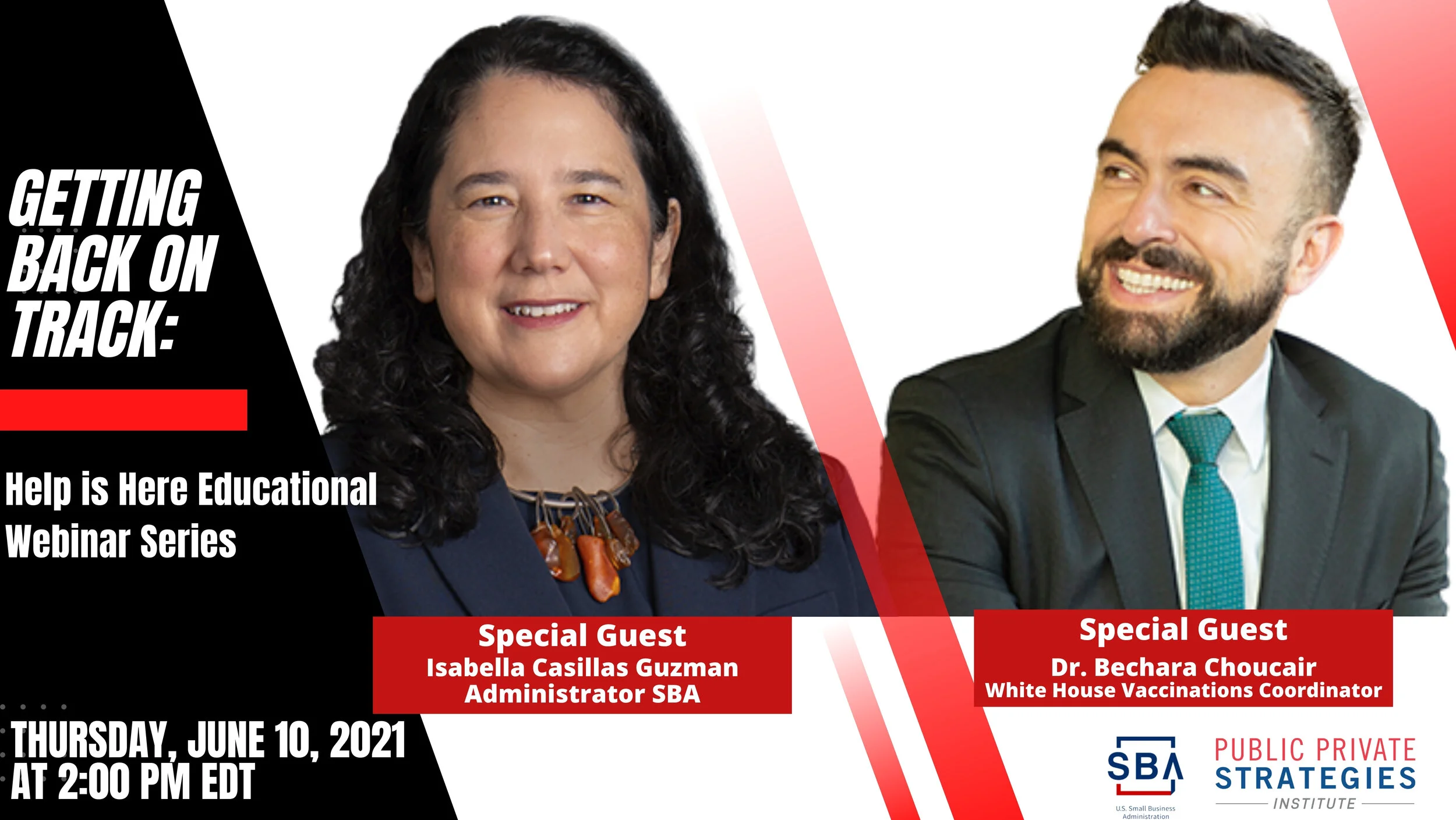 Briefing on Covid-19 Economic Programs and How to Be a Vaccine Leader in Your Community. On Thursday, June 10, the U.S. Small Business Administration (SBA) and the Public Private Strategies Institute will be joined by SBA Administrator Isabella Casillas Guzman and Dr. Bechara Choucair, White House COVID-19 Vaccinations Coordinator to discuss the importance of vaccinations, provide updates on COVID-19 economic aid programs, such as the Economic Injury Disaster Loan (EIDL) and what they mean for your business.