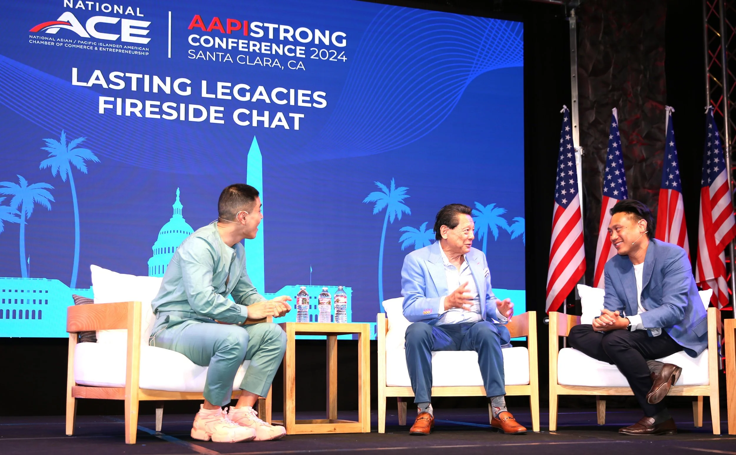 [Left to Right] Bing Chen moderates an inspiring Lasting Legacies Fireside Chat with the 2024 National ACE Trailblazer Award recipients: Lawrence Chu and Jon M. Chu.